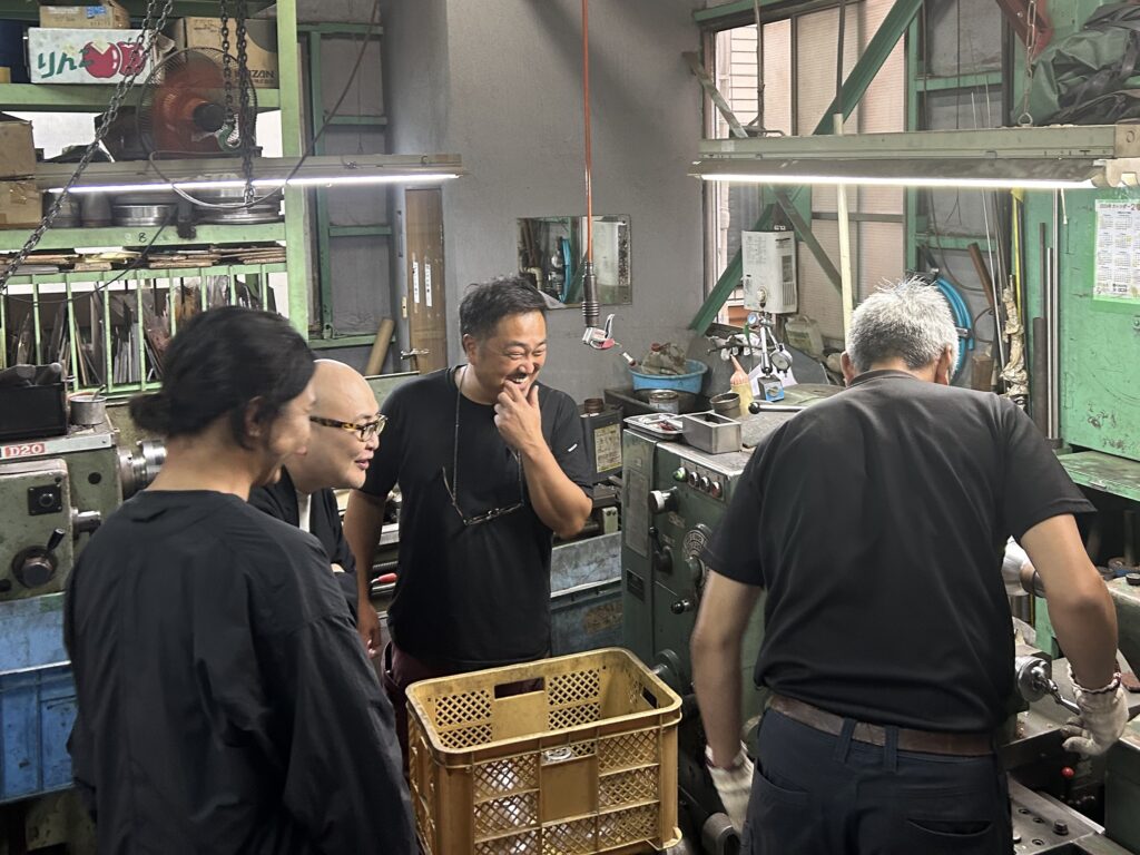 Their first stop was Takahashi Shibori Kogyo, a specialist in the technique of metal spinning. After a warm welcome from President Takahashi, Yanagi and Nakagawa were swiftly taken off for a tour of the factory. As they watched the craftspeople at work, performing intricate spinning techniques before their eyes, and took in the stacks of finely shaped metal components piled high all around, it was clear the experience struck a chord with both visitors.