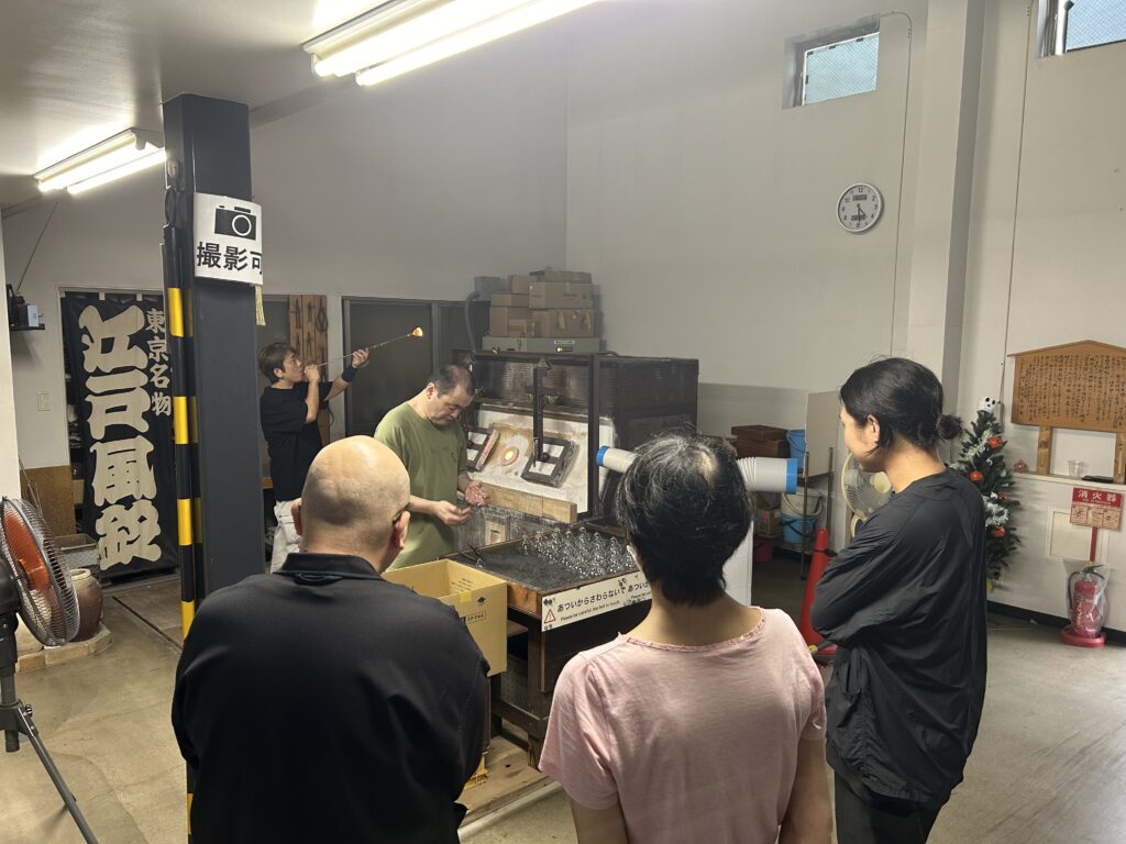 The team observes the chubuki glass-blowing technique, a hallmark of Edo wind chime-making.