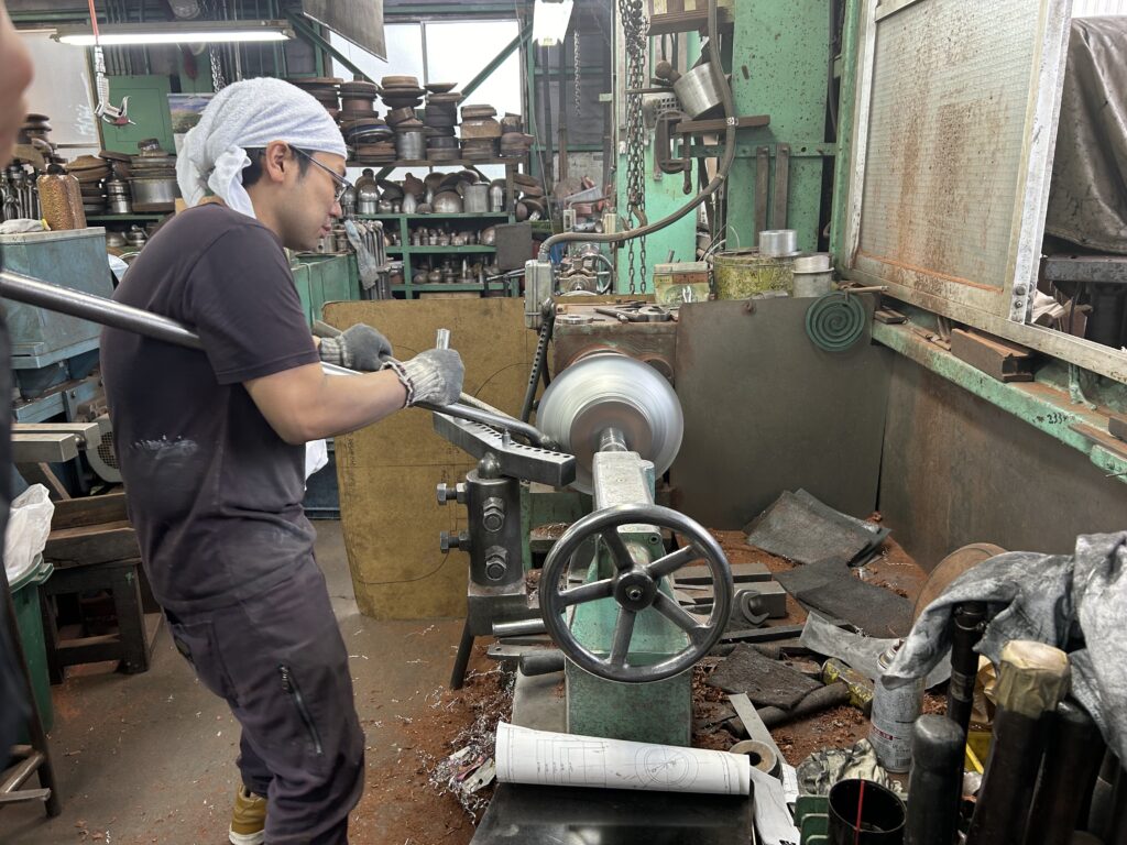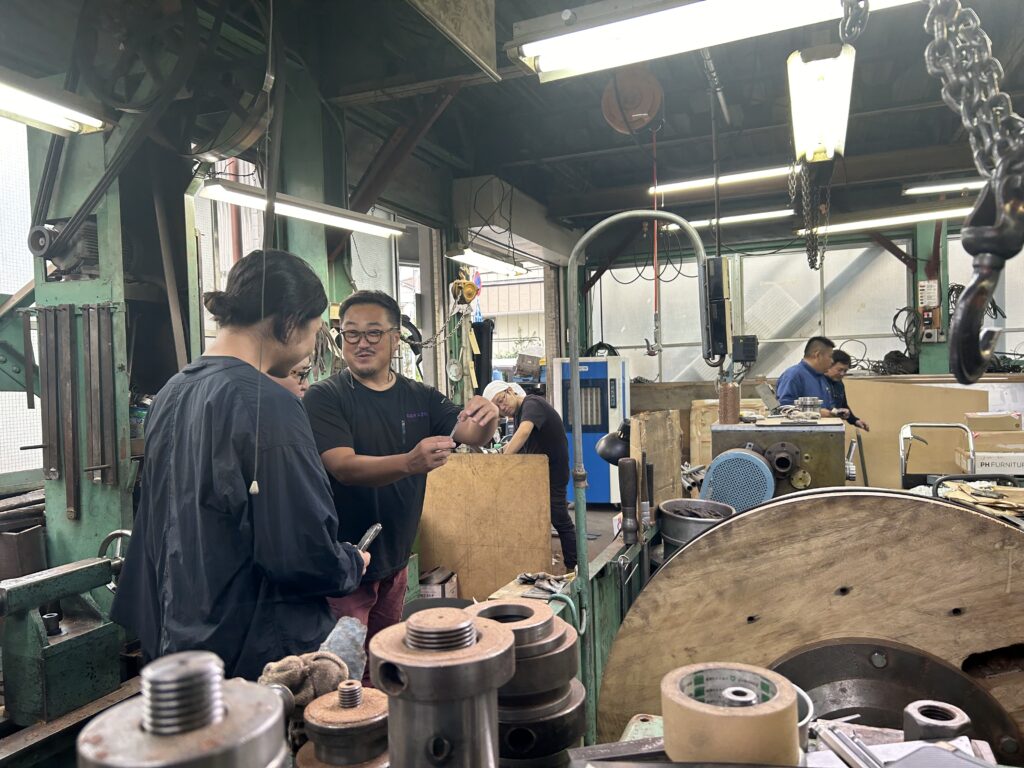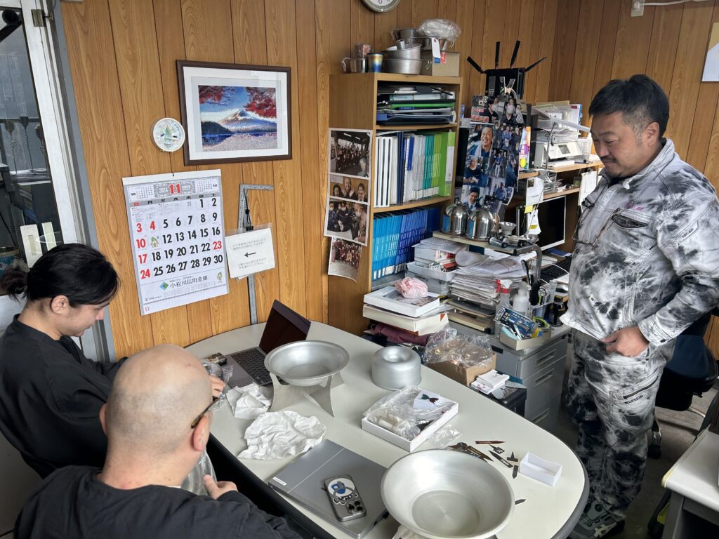 Their first stop was Takahashi Shibori Kogyo, a specialist in the technique of metal spinning. After a warm welcome from President Takahashi, Yanagi and Nakagawa were swiftly taken off for a tour of the factory. As they watched the craftspeople at work, performing intricate spinning techniques before their eyes, and took in the stacks of finely shaped metal components piled high all around, it was clear the experience struck a chord with both visitors.