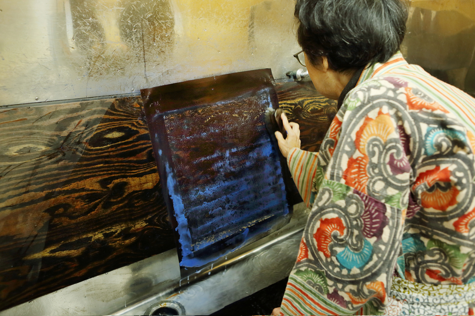 Using a brush, Mitsuhashi carefully washes away paste from the stencil. Even in winter, she avoids warm water so as not to affect the result, working with cold water instead.