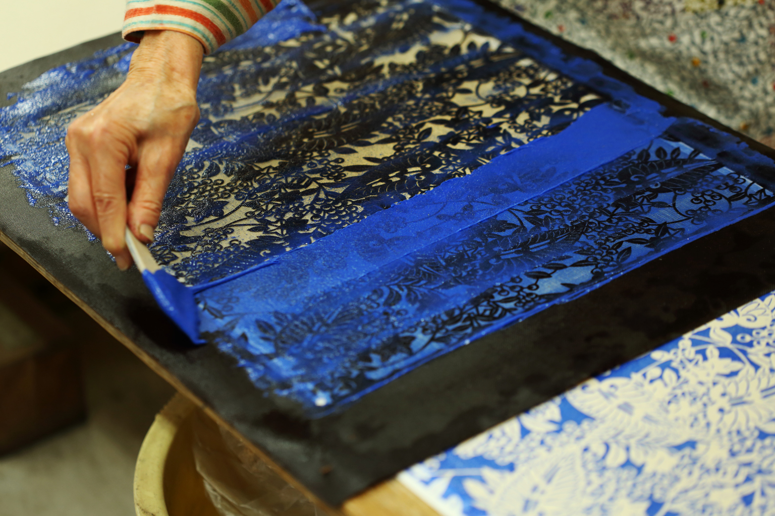 The paste used to transfer the pattern is made by mixing rice flour and ultramarine pigment. The vivid blue highlights where the paste has been applied but disappears completely when washed away. Mitsuhashi prepares this paste freshly each time she works.