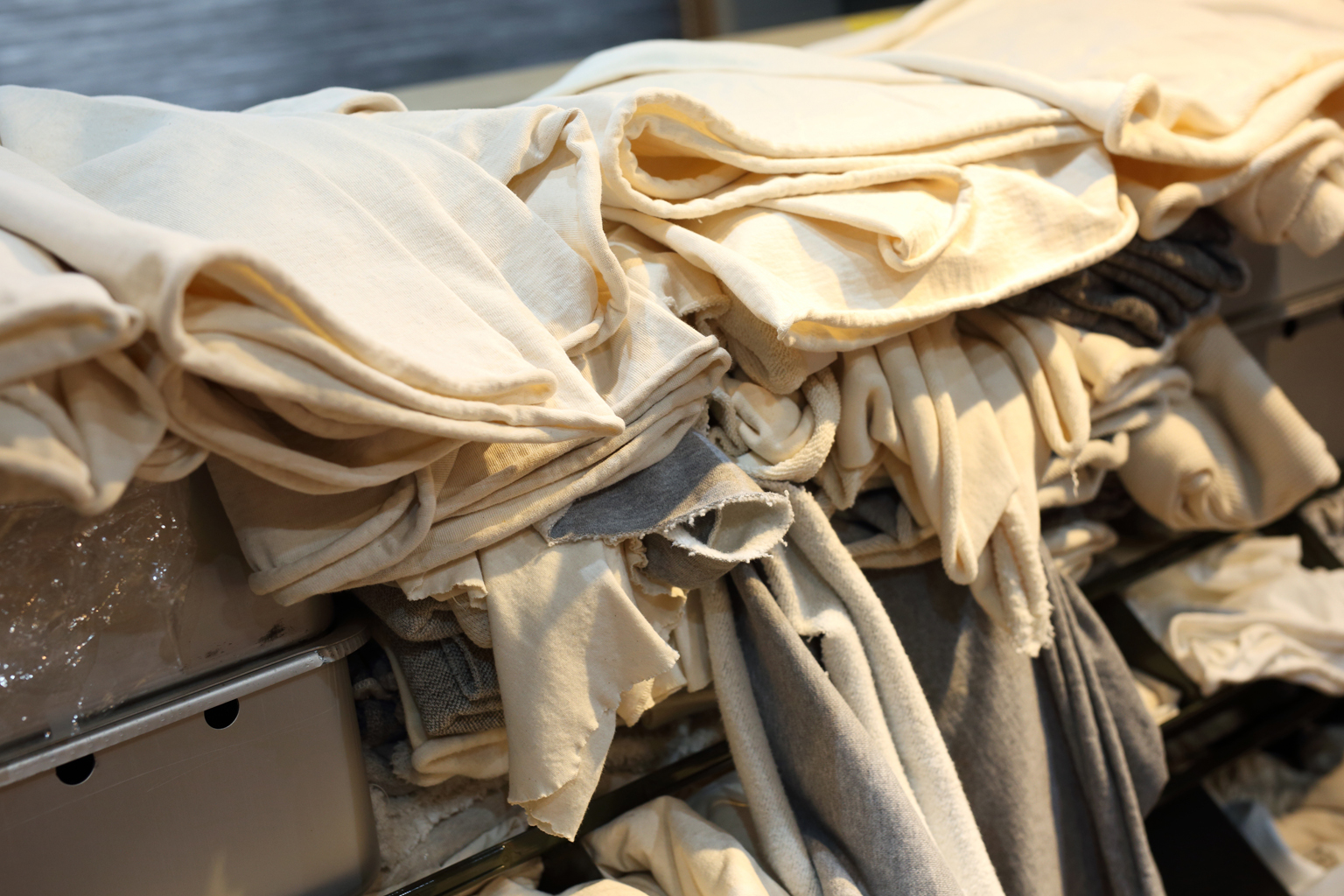 Stacks of fabric samples fill the meeting area. Each one is tagged with information about yarn specifications and knit structure. From soft and drapey to fuzzy and plush, the samples showcase the expressive potential of meriyasu.