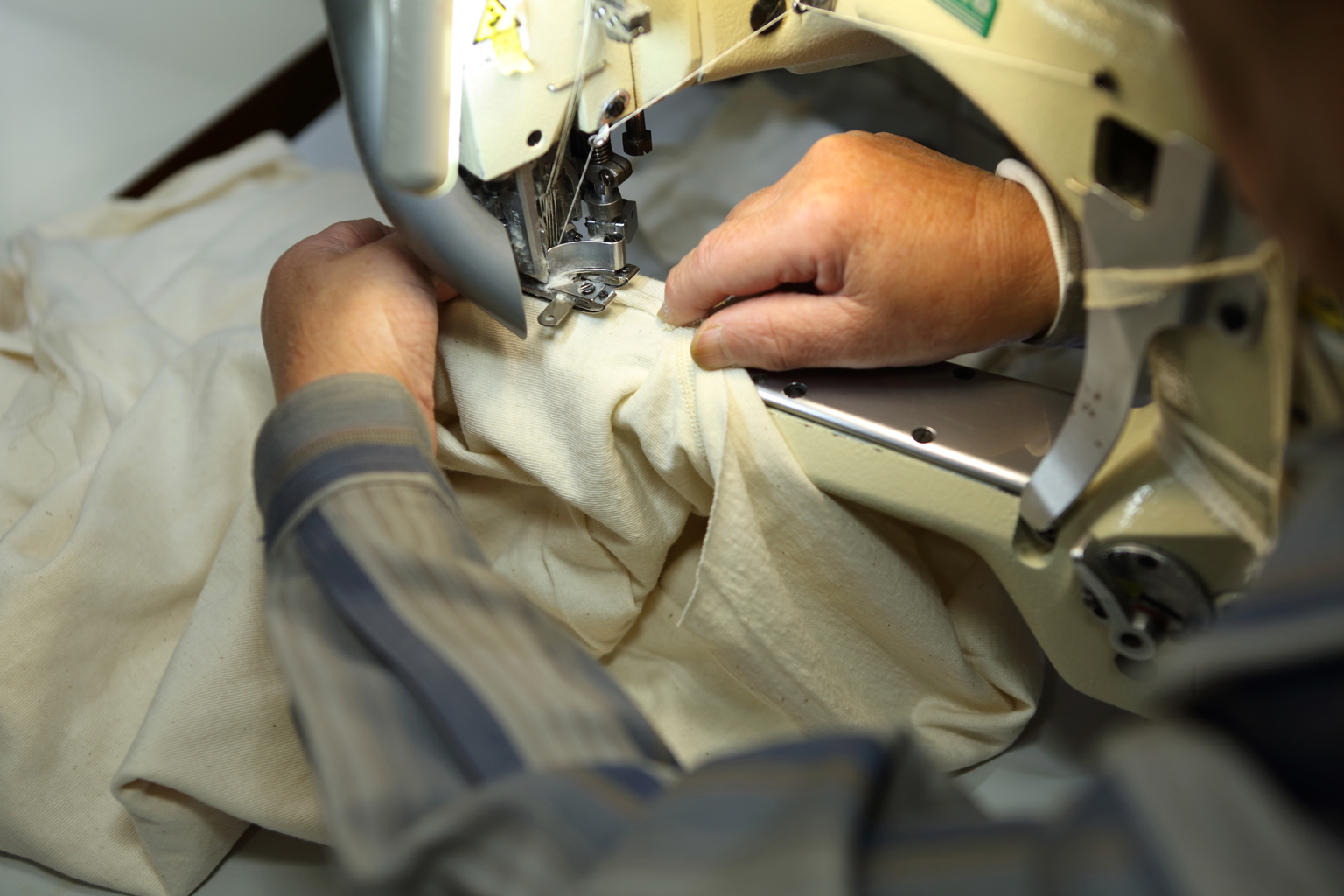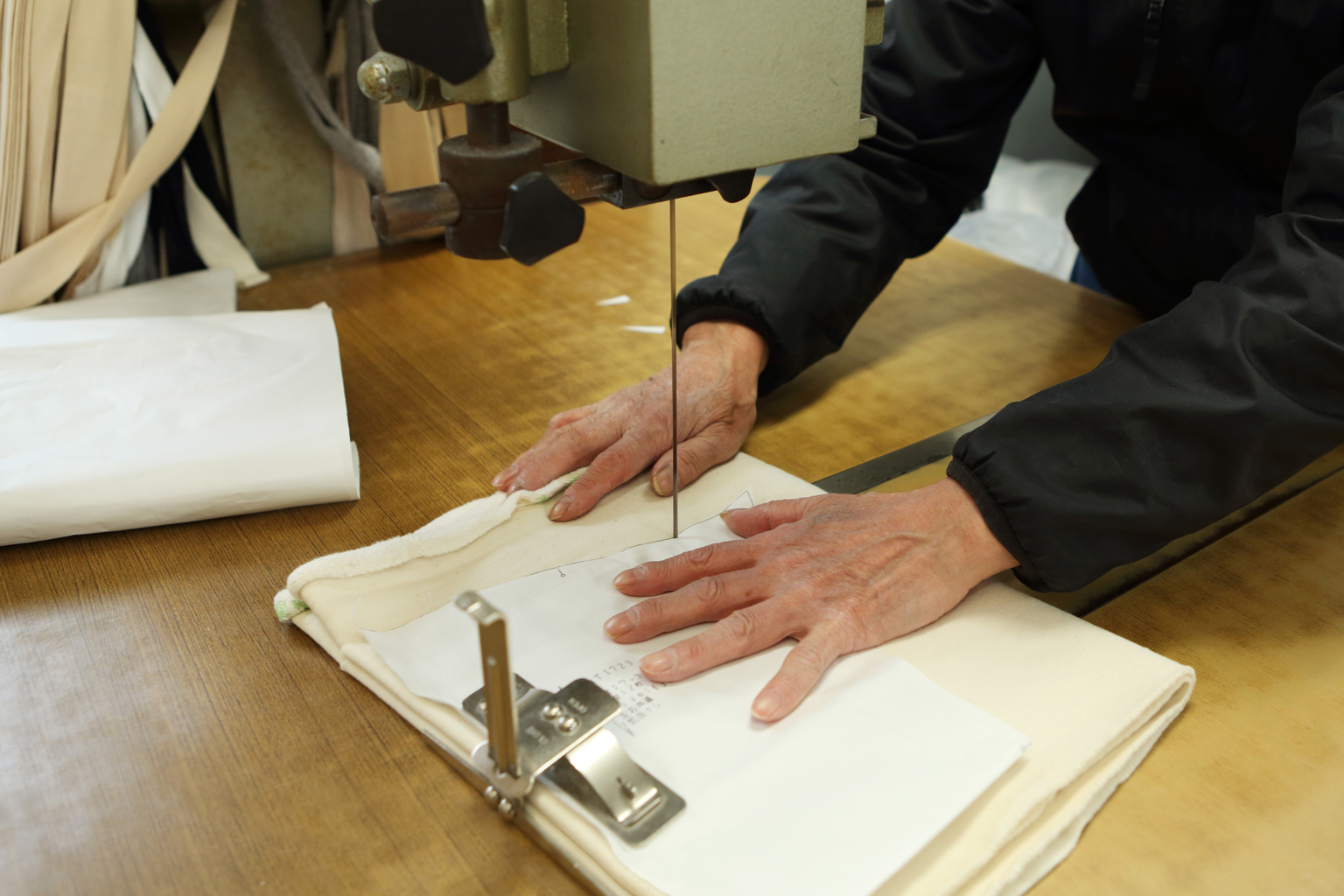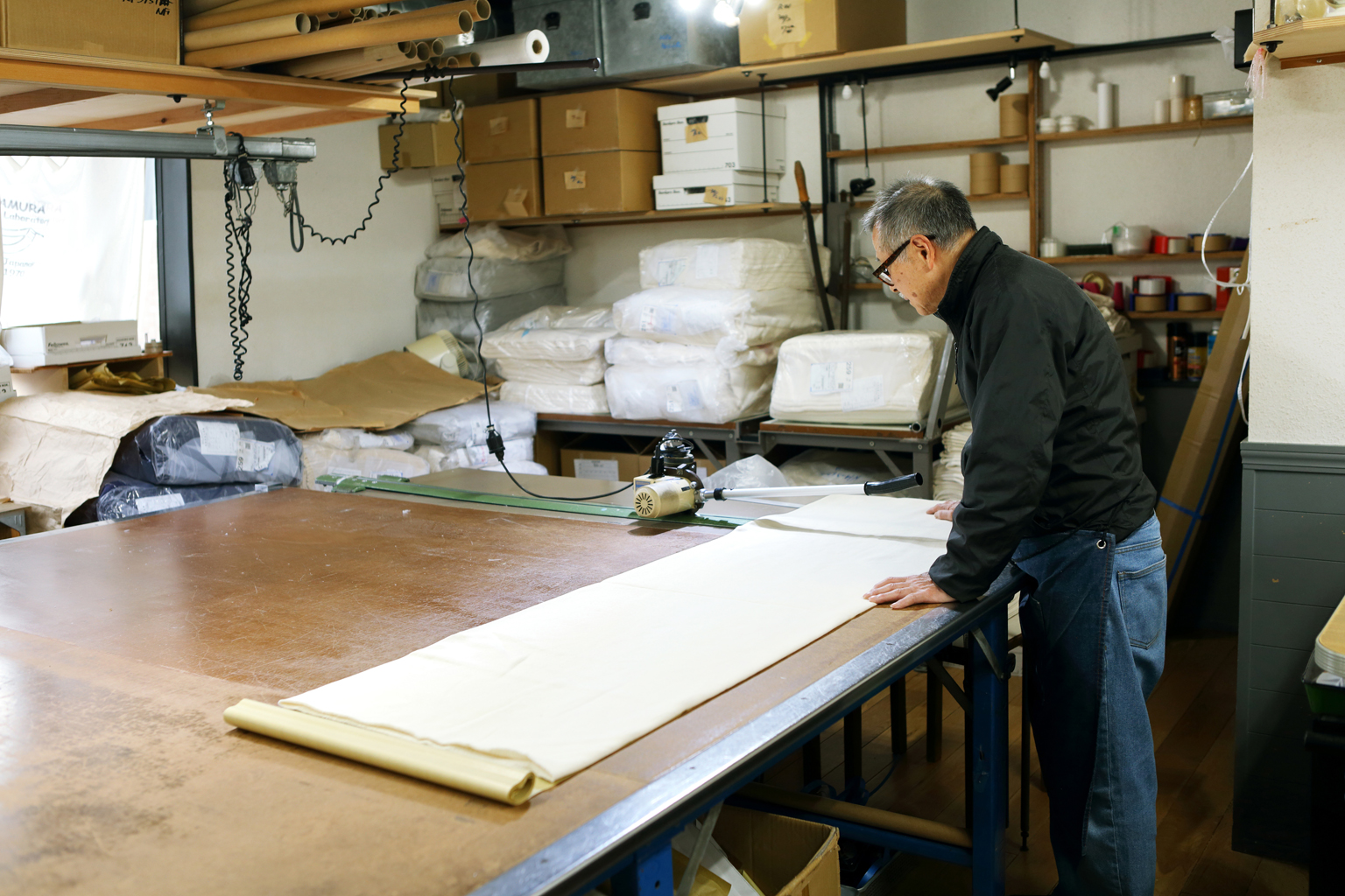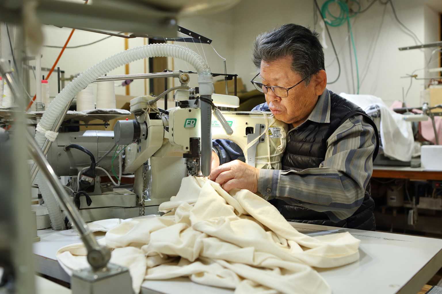 Company founder Nakamura Hidenori, Takayoshi’s father, still contributes on the factory floor as a seasoned seamster. He uses a special flat-seamer machine to join two meriyasu pieces edge-to-edge. The key is to gently stretch the fabric just enough: too much and it warps, too little and it puckers. It is a demanding process that requires fine adjustment to both fabrics characteristics and the rhythm of the sewing machine.