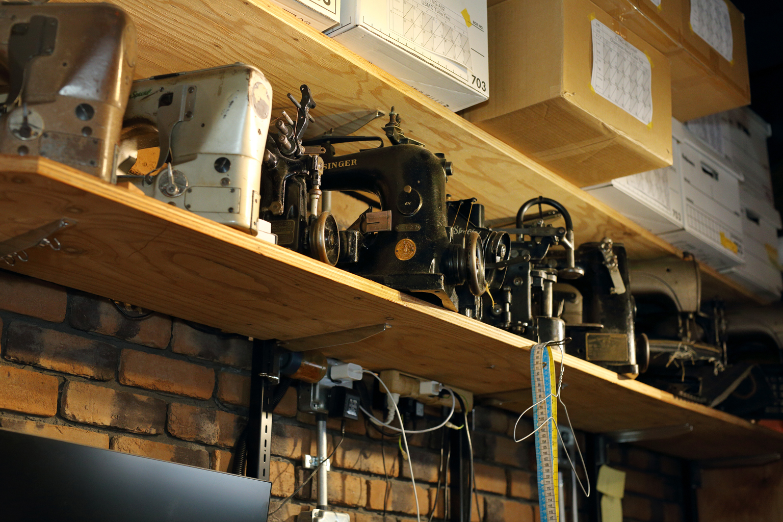 A display of antique sewing machines in a corner of the company’s in-house shop. Beyond their beauty as objects, they inspire reflection on the care and mindset of the craftspeople who used them.