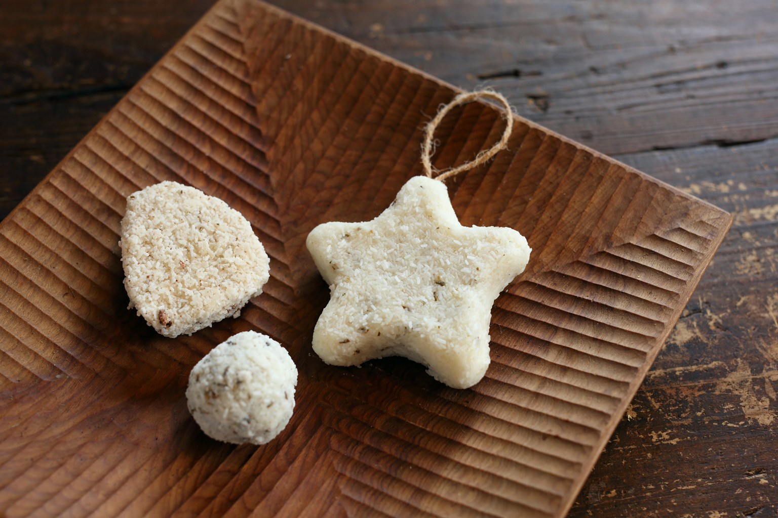 A soap made during one of Suzuki’s workshops. It uses beeswax collected from the caps bees make to seal honey into their combs. Bring it close to your nose, and you’ll catch a delicate, sweet scent.