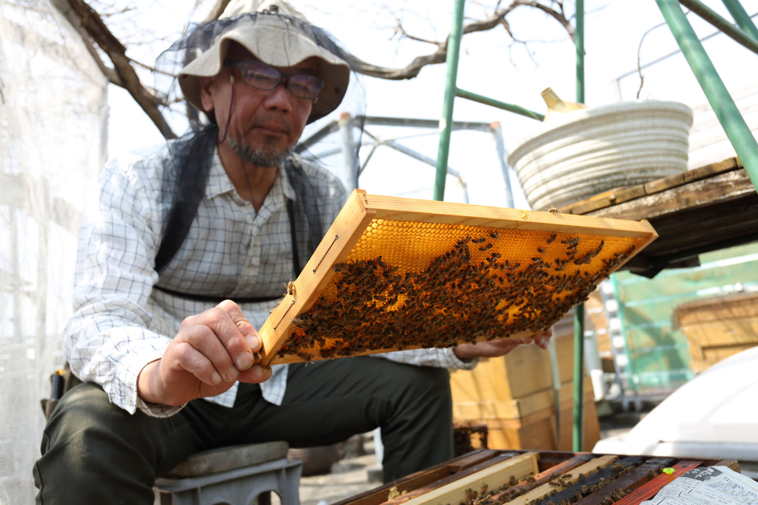 Now operating under the y&y honey label, he manages 4–6 hives in Edogawa City and 15 more on leased farmland in Ichihara, Chiba Prefecture—producing about 250 kilograms of honey annually.