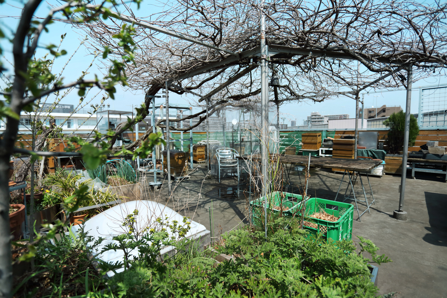 The rooftop apiary. The square wooden boxes are hive boxes where the bees live. Suzuki has also created a relaxing garden space with a pergola, table, and vegetable planters.
