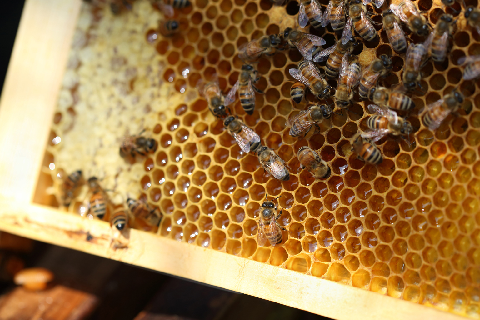 “The glistening spots in the hive are where the honey is stored,” he explains. “The bees flap their wings to evaporate moisture from the nectar, and once the sugar content reaches about 80%, they seal it in with wax. That’s what we harvest.”