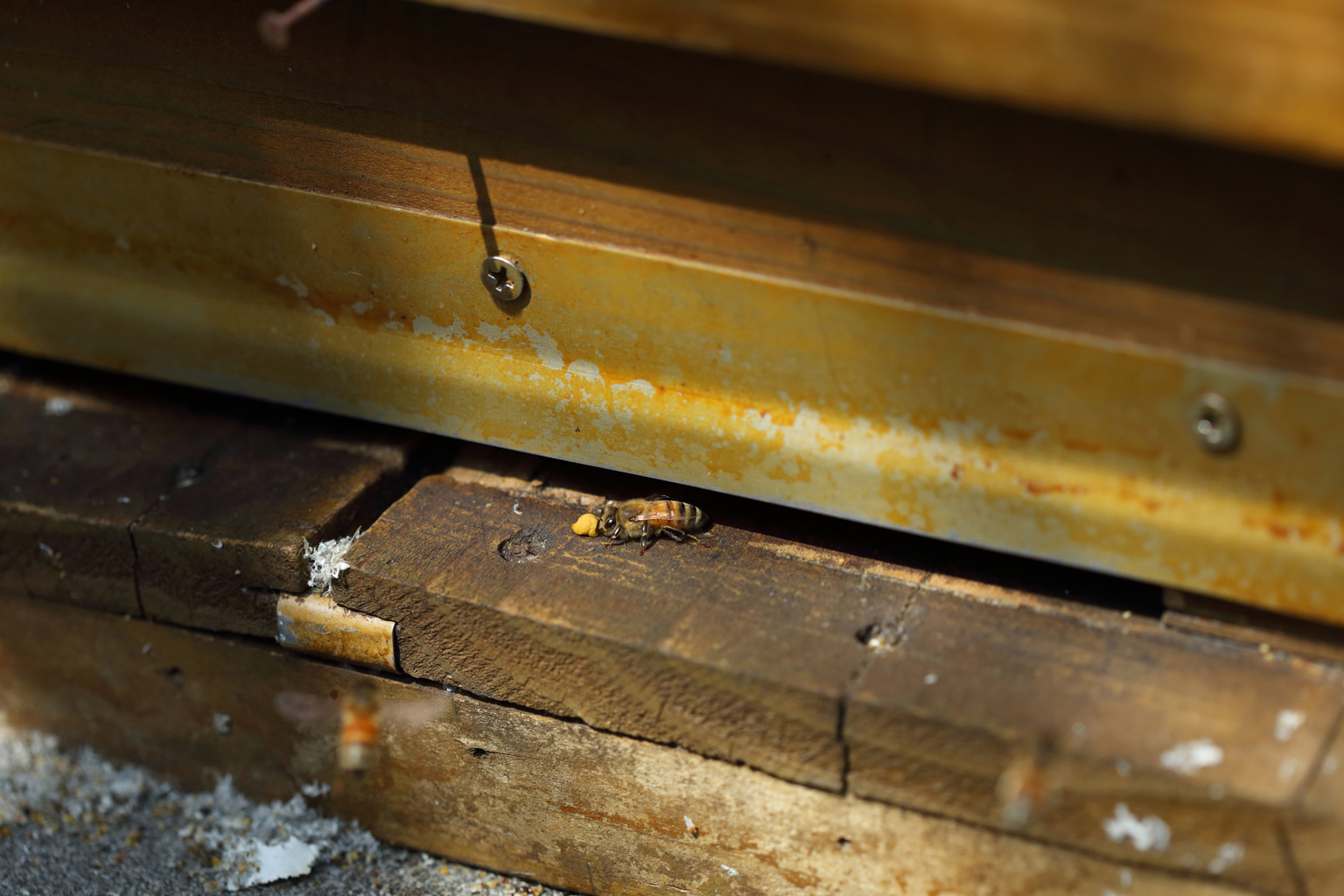 A honeybee with a ball of pollen nearly the size of its own head near the hive box. A single bee will produce only about a teaspoon of honey in its lifetime.
