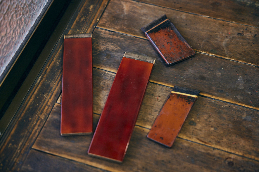 “Urushi is extremely sensitive to temperature and humidity—how it dries and how the color turns out depends on those conditions. That’s why I have to adjust everything throughout the year. Vermilion is particularly tricky. If it dries too fast, it turns brownish. I try to draw out a softer shade by letting it dry very slowly.”