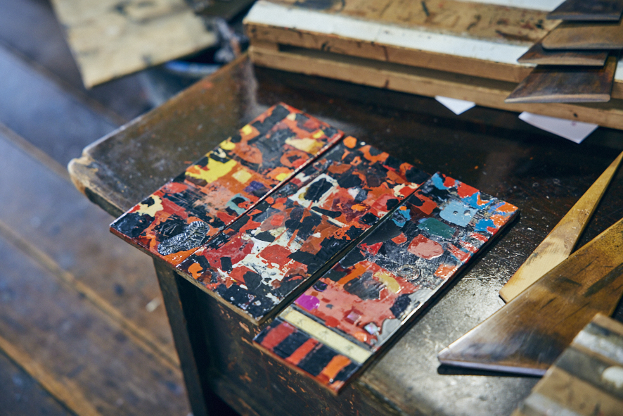 Layers of test applications—achieving the perfect vermilion takes countless trials, as temperature and humidity have a profound effect on the final tone.